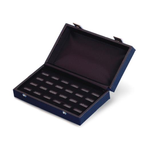 The items in this line include trays and cases for 12, 24, and 36 rings. Cases are wood, covered in textured black vinyl, with simply designed metal latches. Slotted black foam under the velvet inserts hold rings firmly in place.