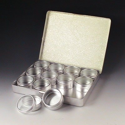 Containers for storing small items, jewels etc 12 aluminium cylindrical containers in a aluminium storage container. Diameter: 35mm Height: 20 mm Quantity: 12 containers
