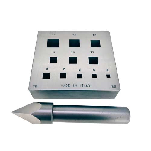 Bezel blocks with punches made from high grade hardened steel. Standard blocks are 17°, excluding BB8, which is 28°, And BB8A1 which is 32°. These blocks are made in Italy.