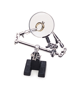 Handy double third hand work holder features clips and magnifier mounted on a weighted base to hold items stable and secure in any position while soldering. Enables user to have both hands free while working.