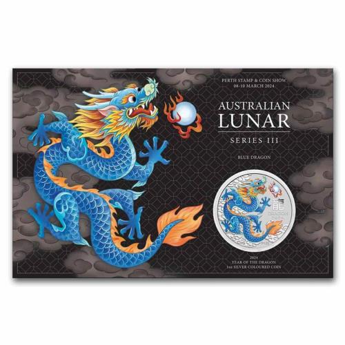 Fine Silver Coin Coloured Blue Dragon 2024 in Card
