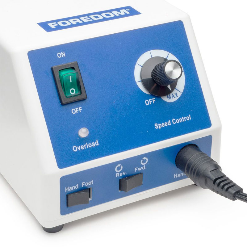 The HP4-917 Control Box is compact with switches on the front for On/Off Power, Forward or Reverse Rotation, and Manual or Foot Speed Control. Speed can be adjusted from low to full speed using the dial on the box or with the foot pedal. An Overload Protector Light is also featured that turns red and sounds a beeping alarm when the motor stalls.