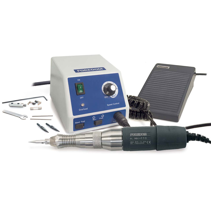 This Hammer Action micromotor is ideal for stone setting applications and engraving techniques. The force of the impact of the MH-011 reciprocating handpiece can be adjusted from light to full by turning the metal ring while the motor is off or running. The speed of the hammer action can also be varied from 0-5,000 strokes per minute with the dial on the control unit. Used with the supplied Graver Holder, the handpiece becomes a precision power engraver- no need for an air compressor or a flexible shaft drive.