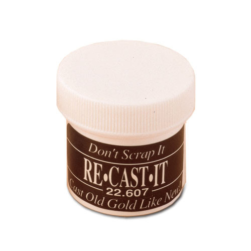Add Re-Cast-It when casting old or scrap gold to achieve a bright yellow, porosity free casting. Increases the fluidity of old metal, while eliminating reddish surface discoloration. One jar is enough for casting approximately 800 dwt. of gold.