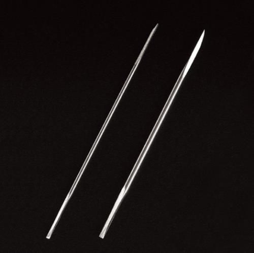 These hard to find spade type pearl drills are double ended and, unlike twist drills, can be easily resharpened. They are best used in the Japanese pearl drilling machine or in some sort of pearl cutting jig.