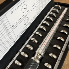 For quick and accurate sizing of wedding rings. British standard sizes H- Z+6 with a corresponding Ring Stick in Aluminium. Presented in a well finished wood box.